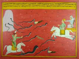 | Description / विवरण | Miniature painting based on Mahabharat - Ashwamegh parva depicting peacocks are fighting with snakes and two warriors are fighting with each other, one on horseback and other on chariot. |