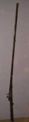 | Description / विवरण | Long, single barrel flint lock Pathredar gun with simple wooden butt. |