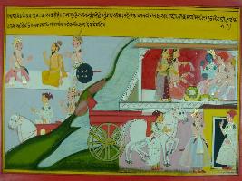 | Description / विवरण | Miniature painting based on Mahabharat - Ashwamegh parva depicting Vyas is asking Yudhisthir to ask Bhim to go to Dwarika and bring Krishna. Bhim reaches Dwarika to bring Krishna and saw him sitting with Rukmani, Satyabhama and Devki. |