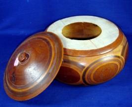 | Description / विवरण | Wooden container circular in shape with lid and knob. It is having line designs all over. The neck is partly broken. |
