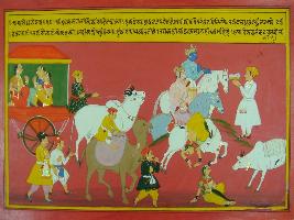 | Description / विवरण | Miniature painting based on Mahabharat - Ashwamegh parva depicting that Krishna and Balram is marching with some females, then a female fall down from horse. It also depict a man come over there and told something to Krishna. |