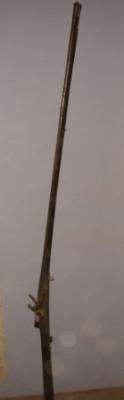 | Description / विवरण | Long, single barrel flint lock Pathredar gun with simple wooden butt. |
