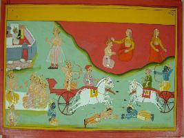 | Description / विवरण | Miniature painting based on Mahabharat - Vana parva depicting on the upper right Karna is coming to meet Duryodhan. Below it, Pandavas are depicted. On the upper left Kunti is giving blessing to Karna. At the lower part fight between Karna and Arjun is depicted where they could not defeated each other and lie down on the ground. |
