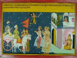 | Description / विवरण | Miniature painting based on Mahabharat - Ashwamegh parva depicting that Rukmani talking to Satyabhama by seeing Krishna coming to Dwarika. |