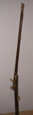 | Description / विवरण | Long, single barrel flint lock Pathredar gun with simple wooden butt. |