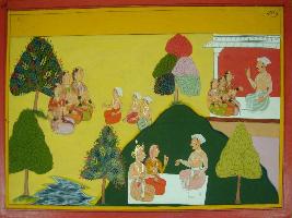 | Description / विवरण | Miniature painting based on Mahabharat - Vana parva. On the upper part three woman depicted talking to three children and a man is talking to three woman and on the lower part an old royal couple is depicted talking to a man. |