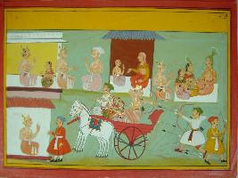| Description / विवरण | Miniature painting based on Mahabharat - Vana parva depicting elopement of princess Amba, Ambalika and Ambika by Bhishma. At the lower middle part, Bhishma is taking princess in chariot and shown shooting arrow on soldiers. At the top right, Ambika shown talking to Vichitravirya. At the upper left, Amba and Ambalika getting married to Vichitravirya. |