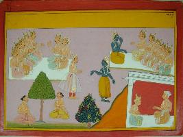 | Description / विवरण | Miniature painting based on Mahabharat - Vana parva. On the upper part seven royal persons are depicted sitting. On the other side Krishna is depicted sitting with five person probably Pandavas. On the lower side two old men are depicted sitting. |