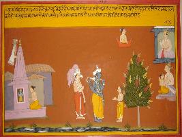 | Description / विवरण | Miniature painting based on Kashi khand depicting Dhruv praying to lord Vishnu and nearby Garuda is shown standing at the middle of painting. At the right side, he is shown worshipping Vishnu in temple, Ganga is depicted at the lower level. At the left side king is depicting in a palatial window. Below it, Dhruv is shown sitting on lap of his father. |