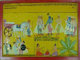 | Description / विवरण | Miniature painting based on Mahabharat - Ashwamegh parva depicting that Krishna brings Shalya to Yudhisthir. Yudhisthir is touching feet of Krishna and ask him to help him in the yagna. |