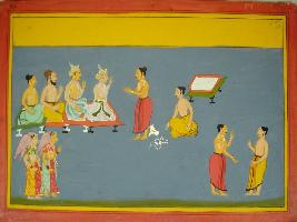 | Description / विवरण | Miniature painting based on Mahabharat - Vana parva. Arjun is depicted in Swargalok. Indra is depicted with his priest and courtiers and Apsaras. |