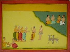 | Description / विवरण | Miniature painting based on Mahabharat - Vana parva depicting four kings with folded hands in front of a Brahman. At the lower right corner two men are performing yajna. At the upper left four persons are in conversation. |