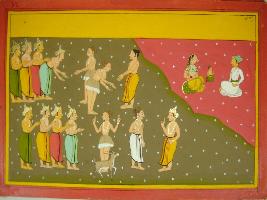 | Description / विवरण | Miniature painting based on Mahabharat - Vana parva depicting Pandavas paying homage to a Yogpurush. On the upper left one couple with their son is depicted. |