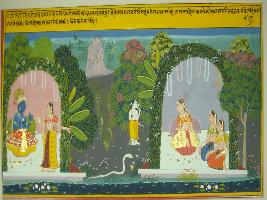 | Description / विवरण | Miniature painting based on Geet Govind depicting Krishna and a Sakhi friend of Radha on the right hand side of the painting and she telling him about the condition of Radha that she looks like a sandal tree without snake. |