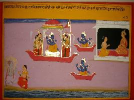 | Description / विवरण | Miniature painting based on Kashi khand depicting Agastsya sage telling to Lopamudra depicted in lower right corner that Ganas saying Shivsharma that they had reached Mangal Lok . Mangal griha is depicted at the upper left part. |