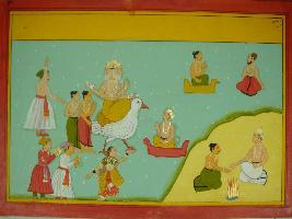 | Description / विवरण | Miniature painting based on Mahabharat - Vana parva depicting at the lower left corner Yudhisthir performing yagna and giving daan. At the right side Brahma on his Vahan, musicians and apsaras are depicted. |
