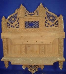 | Description / विवरण | Wooden wall hanging having floral carvings and in front three foldable platforms are fixed on it. |