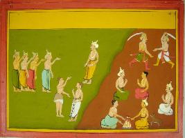 | Description / विवरण | Miniature painting based on Mahabharat - Vana parva. The left side depicts kings are fighting themselves, listening to Brahmans, performing yagna etc. At the right side four kings are talking to another king. |