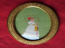 | Description / विवरण | This miniature painting depicts Maharaja Prithvi Singh in standing pose holding a sword of red colour with a golden handle. He is wearing a long tunic dress of white colour. A red turban having golden green colour design in placed on his head. A yellow with golden colour drapery is tied around his waist. A plaint pony of the hair is coming outside the red turban. Fish like eyes, profile position and minute detailing are the specialities of a miniatrue painting. The whole background of the miniature painting is in green colour. |