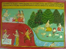 | Description / विवरण | Miniature painting based on Mahabharat - Ashwamegh parva depicting with his queen and daughter, a man is depicted with his wife, Agni is depicted on goat and a Brahman is depicted doing yagna with a woman in a forest and a man is swimming in a river. |