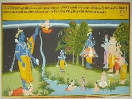 | Description / विवरण | Miniature painting based on Geet Govind depicting Vishnu s Trivikram incarnation where one leg of Vishnu is on heaven and the other is on king Bali. While in left side Krishna is seen with Shiv, Brahma, Indra and an Ayudh purush. |