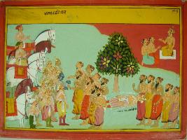| Description / विवरण | Miniature painting based on Mahabharat - Vana parva depicting Bhishma lying on bed of arrows and near by, some sages are shown standing at lower left part. At the right part, Pandavas with their men are shown coming to see Bhishma and greats sages. At the upper left part, Indra is shown talking to other god. |