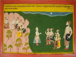 | Description / विवरण | Miniature painting based on Mahabharat - Vana parva. Pandavas are walking, it become night, moon appeared in sky, Kuber come to meet them and they depicted resting in Asti rishi s ashram. |