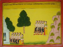 | Description / विवरण | Miniature painting based on Mahabharat - Vana parva. Pandavas had been depicted with Draupadi and they are shown visiting a temple of Vishnu. |