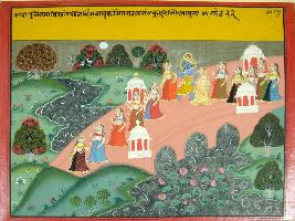 | Description / विवरण | Miniature painting based on Krishna avatar charit depicting the story of Raas Lila. In which Krishna and gopis walking toward the garden. It is an incomplete painting. |