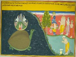 | Description / विवरण | Miniature painting based on Geet Govind depicting the Kurma incarnation of Vishnu which in the left side Vishnu Brahma and Shiv is seen while a man is seen in Anjalihasta mudra. |