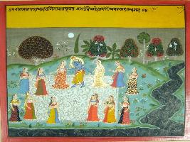 | Description / विवरण | Miniature painting based on Krishna avatar charit depicting the story of Raas Lila performed by Krishna and gopis in garden. It is an incomplete painting. |