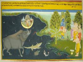 | Description / विवरण | Miniature painting based on Geet Govind depicting the Baan incarnation of lord Vishnu while Krishna, Shiv, Brahma, Indra and an Ayudh purush is seen in the left side of the painting. |