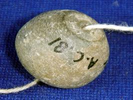 | Description / विवरण | Terracotta bead, bi-convex in shape and having a large perforated hole in the centre. It has incised geometrical designs on both sides and separated by an incised line around the flair. |