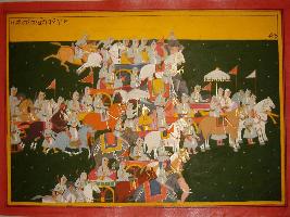 | Description / विवरण | Miniature painting based on Mahabharat - Bhishma parva. The painting depicts the army of Kauravas under the commander in chief Bhishma marching to the battle field. |