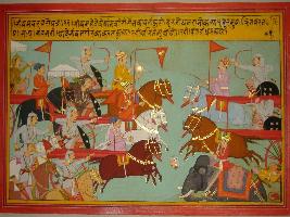 | Description / विवरण | Miniature painting based on Mahabharat - Bhishma parva depicting f Bhishma, Duryodhan, Kritavarma, Shalya Bibesati are attacking the army of Pandavas than Abhimanyu comeup and start fighting with them. |