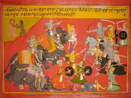 | Description / विवरण | Miniature painting based on Mahabharat - Bhishma parva It depicts Kauravas and Pandavas are fighting vigorously with each other with elephants, horses and infantry soldiers. |