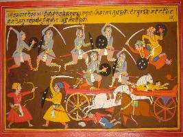 | Description / विवरण | Miniature painting based on Mahabharat - Bhishma parva depicting Kauravas and Pandavas are fighting vigorously with each other. |