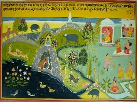 | Description / विवरण | Miniature painting based on Gajendramoksha depicting scene of forest and river side where animals, celestial figures, sages and couples are depicted in their various activities. |