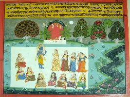 | Description / विवरण | Miniature painting based on Krishna avatar charit depicting the story of Raas Lila performing by Krishna with gopis in the garden. It is an incomplete painting. |