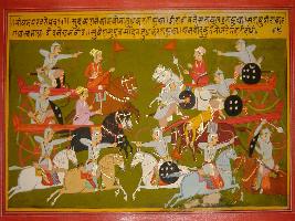 | Description / विवरण | Miniature painting based on Mahabharat - Bhishma parva depicting Sudeshya and Kamboj are fighting with each other and on the other side Satayu and Iravan are fighting with each other. |