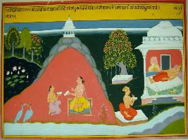 | Description / विवरण | Miniature painting based on Gajendramoksha depicting a rishi giving lecture to another rishi. A man is lying and dreaming that he got moksha. A temple is seen on the peak of a mountain. |