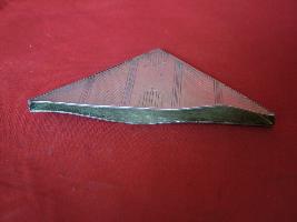 | Description / विवरण | It is a metal object used as corner used at the four ends of the bloting pad. It is made of silver and in triangular shape. It has design on one side and the backside is plain. It has slightly bent sheets. |