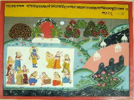 | Description / विवरण | Miniature painting based on Krishna avatar charit depicting Krishna with gopis in full moon night. Asana is seen on the top. |