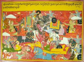 | Description / विवरण | Miniature painting based on Mahabharat - Drona parva. Dristadumna depicted fighting with Duryodhona, Yudhisthir and Dron is also depicted fighting. |