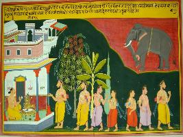 | Description / विवरण | Miniature painting based on Gajendramoksha depicting a king named Indradhumana, who is worshipping Parmeshvar. A group of rishis and a female monk are coming to his temple. An elephant is shown in the top left corner of the painting. |