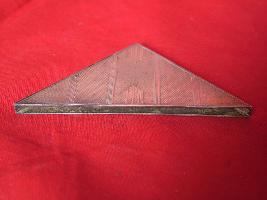 | Description / विवरण | It is a metal object used as corner used at the four ends of the bloting pad. It is made of silver and in triangular shape. It has design on one side and the backside is plain. |