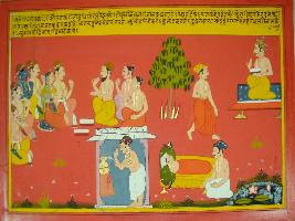| Description / विवरण | Miniature painting based on Mahabharat - Vana parva. The painting depicts Pandavas along with Draupadi talking with Agastsya muni while Raja Janak is seen in the left side of the painting. |