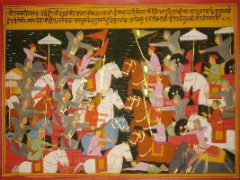 | Description / विवरण | Miniature painting based on Mahabharat - Drona parva depicting while Yudhisthir seen Drona killing vigorously the army of Pandavas, he ordered Arjun and Dhristadum to stop Drona. After that all heros like Yudhisthir, Arjun, Dhristadum and Abhimanyu starts fighting against Drona. |