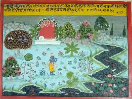 | Description / विवरण | Miniature painting based on Krishna avatar charit depicting Krishna playing flute on the bank of Yamuna. Trees, flowers and birds are seen at the background. The painting is unfinished. |
