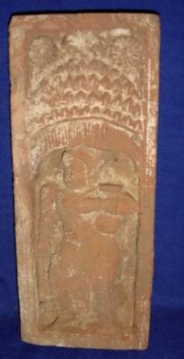 | Description / विवरण | Terracotta brick carved with floral designs on top and below it, a female is depicted in niche holding a pitcher in her left arm. |